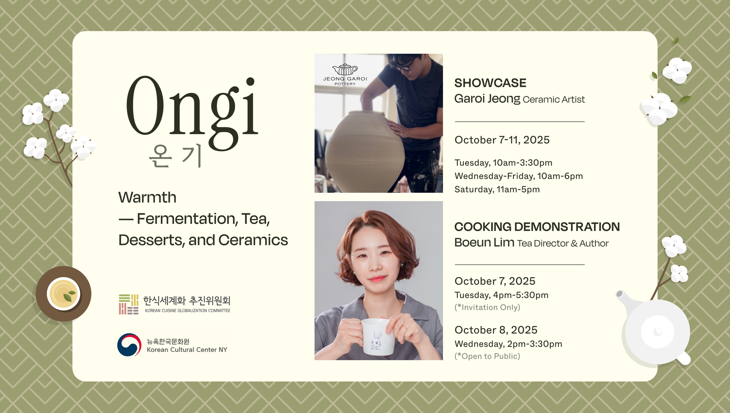 The Korean Cuisine Globalization Committee (KCGC) proudly presents Ongi (온기): Warmth — Fermentation, Tea, Desserts, and Ceramics – Showcase & Live Experience, an immersive program exploring the harmony of fermentation, tea, desserts, and ceramics. The event is supported by the Korean Cultural Center New York.