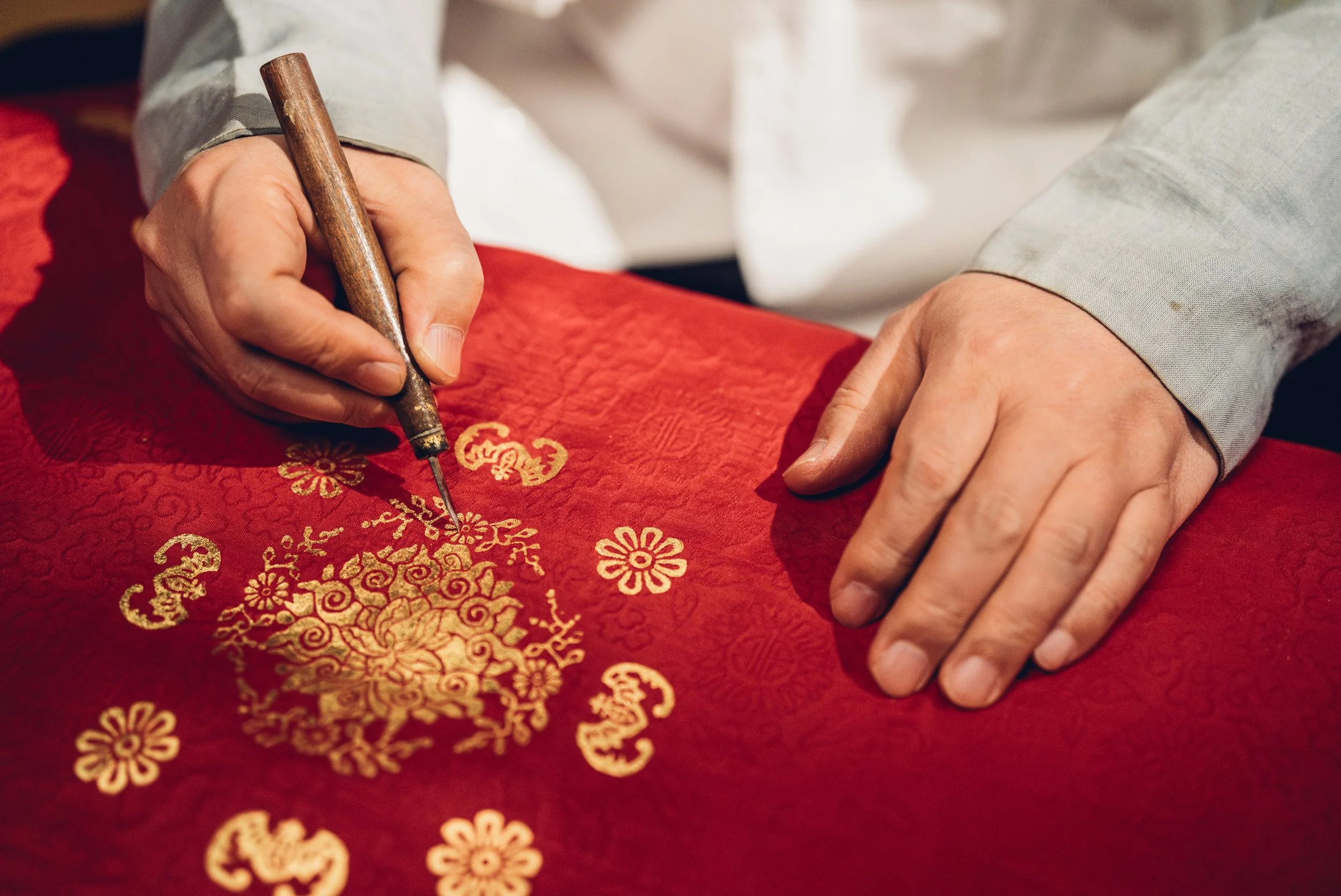 Korean traditional patterns enriched the meaning and value of everyday life by combining material form with symbolic significance across a wide range of objects. Gold-leaf dragon motifs adorning royal items expressed the king’s authority to govern the heavens; bat motifs decorating the gat of the yangban upper class symbolized blessings and good fortune; vine patterns on luminous mother-of-pearl lacquer boxes conveyed vitality and prosperity; bosanghwa floral motifs carved on hwagak boxes represented eternal beauty; and butterfly motifs on norigae, imbued with the spiritual meaning of longevity and immortality, expressed wishes for harmony and happiness. As a representative work, Procession of Magpies and Tigers Wedding -Chest Wrapping Cloth, which carries forward the tradition of Joseon royal bridal bojagi, depicts tigers that ward off evil and magpies that herald good news, rendered in gold. By developing the refined aesthetics of the royal court and the essence of aspiration embedded in traditional aesthetics through a contemporary sensibility, the work conveys a wish for the advancement of Korean cultural growth.
