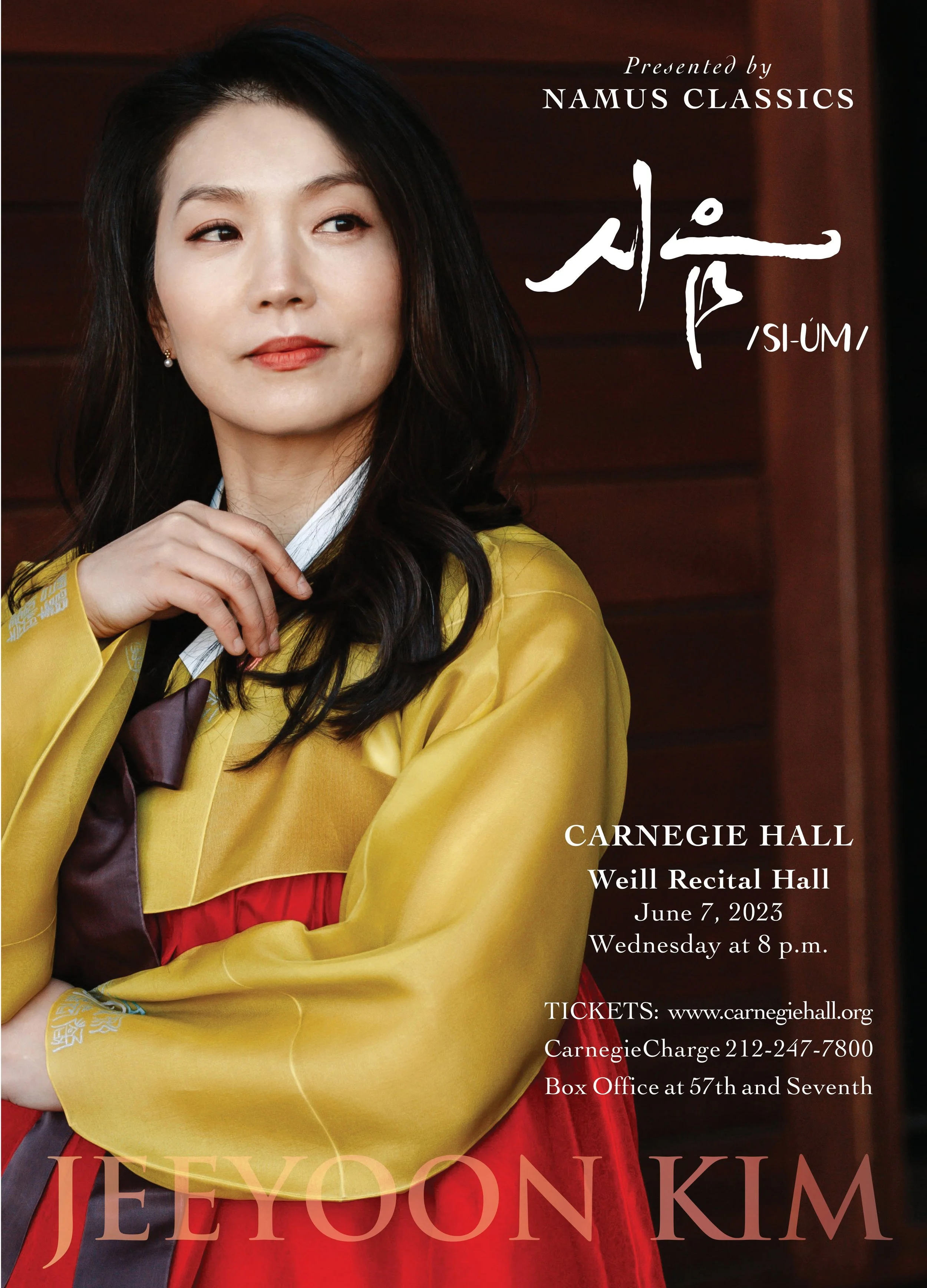 The project is part of an album of the same title; its name is a blend of the words poetry and music in Korean. Jeeyoon debuted 시음 /si-úm/ in San Diego, and the Carnegie Hall performance is part of a 30-city tour across the United States this season.